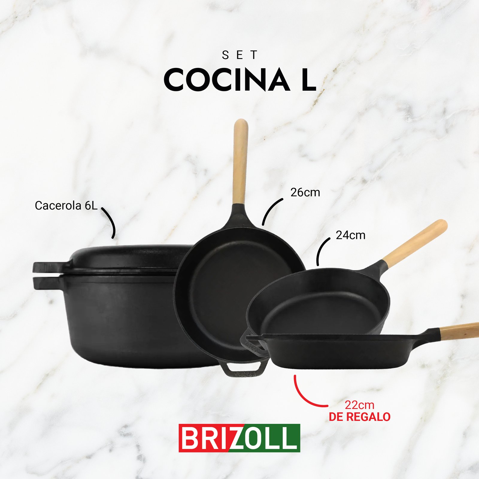 Un set completo, práctico y pensado para quienes cocinan todos los días y quieren disfrutar del rendimiento, la durabilidad y el sabor único del hierro fundido Brizoll.